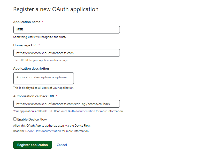 为了让 Cloudflare 能够代表你的用户向 GitHub 请求身份验证,你需要在 GitHub 中注册一个 OAuth Application。