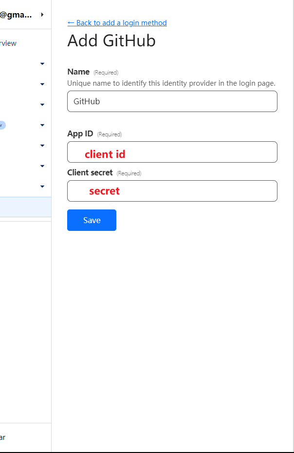 GitHub作为登录方式。 - 关键:不要直接点击开启默认的 GitHub 集成,而是要填入你刚刚在 步骤 3 中获取的 Client ID 和 Client Secret。这表示你正在使用自定义的 OAuth App,以便后续与特定的 GitHub Organization 关联。