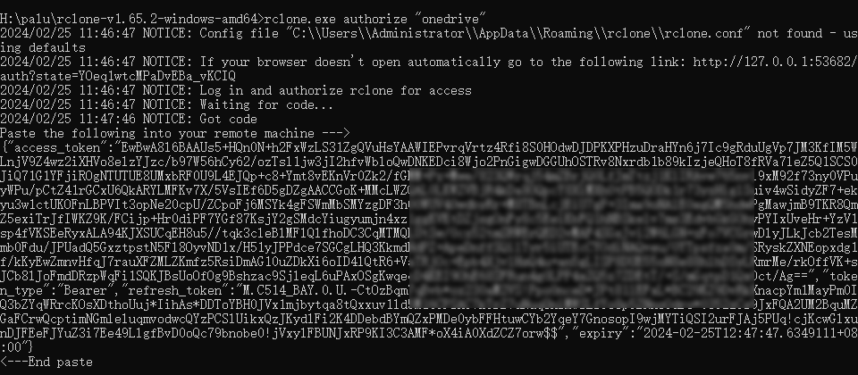 然后会跳转到浏览器的登录页面,登录并授权成功后cmd命令框就会返回你的token,注意不要登错账号了。保存好{xxxxxxxxxxx}备用。