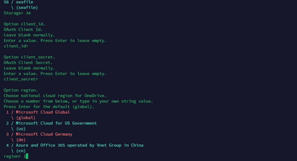 client_id和client_secret直接回车默认即可。也可以进入 Microsoft Azure 应用注册页面,新注册一个,并添加需要的权限,如果使用自己的id, 请确保配置正确,不然最后会挂载失败。- 注意这一步输入