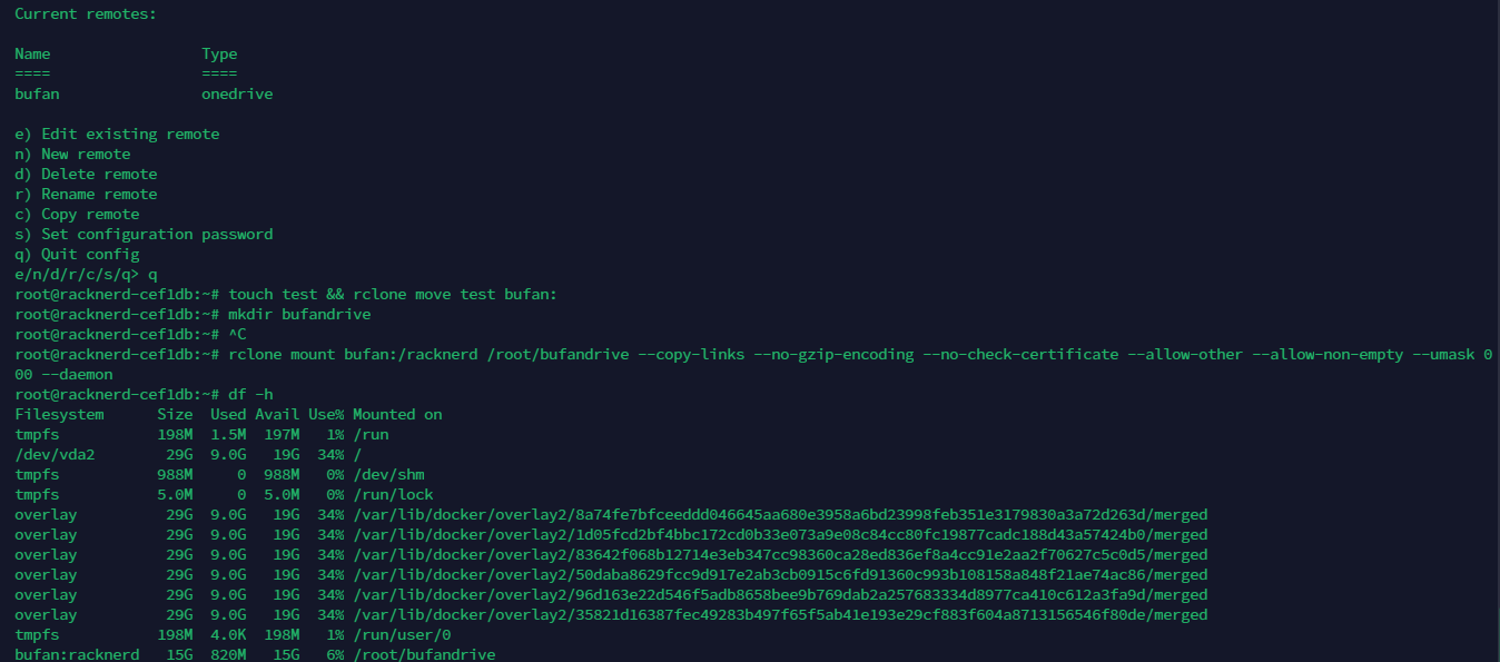 1 | rclone mount bufan:/racknerd /root/bufandrive --copy-links --no-gzip-encoding --no-check-certificate --allow-other --allow-non-empty --umask 000 --daemon |