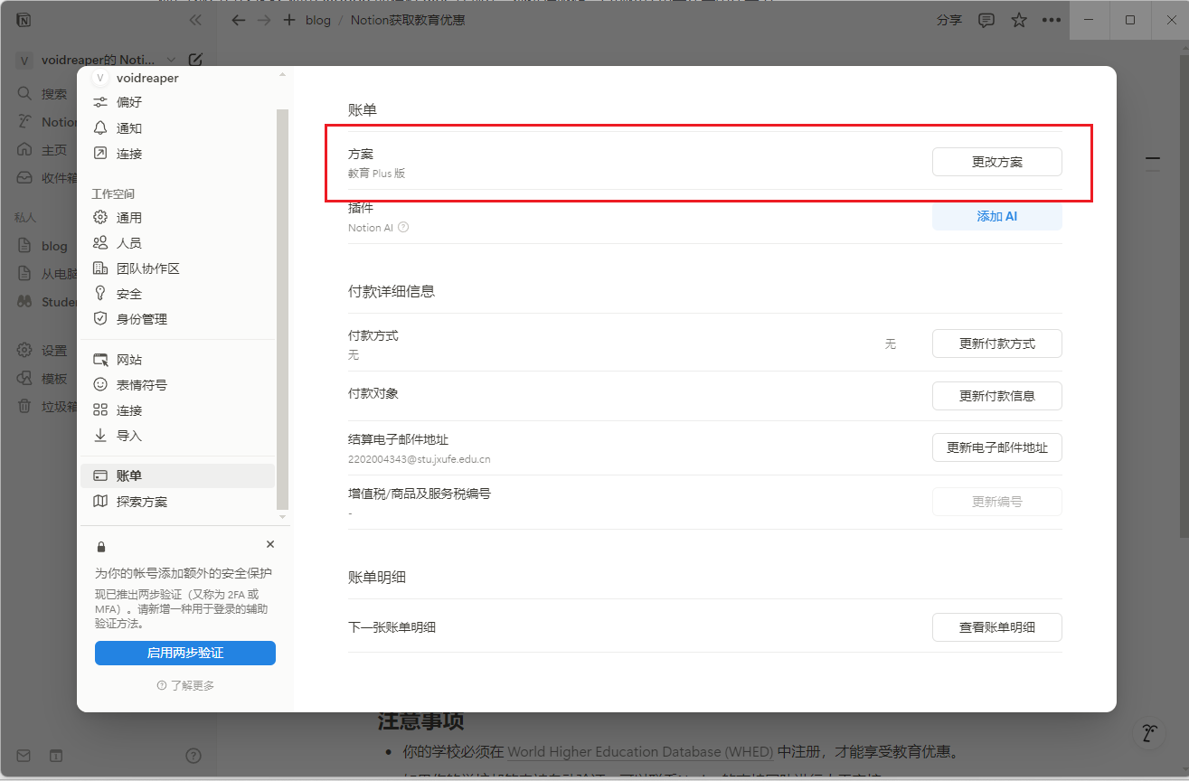 确保你的Notion账号绑定的是学校提供的教育邮箱,注册完成之后可申请教育版。
